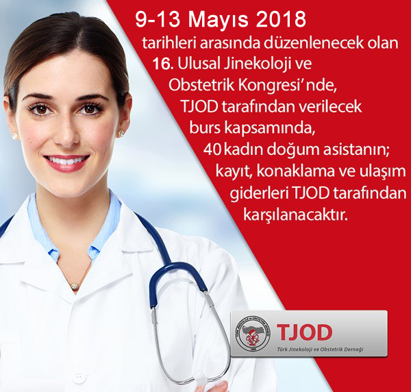 09-13 Mayıs 2018 tarihleri arasında düzenlenecek olan 16. Ulusal Jinekoloji ve Obstetrik Kongresi’ne 40 kadın doğum asistanı TJOD tarafından burslu olarak gönderilecektir. Burs kapsamında 40 kadın doğum asistanının ulaşım, kayıt ve konaklama giderleri karşılanacaktır. Başvurular www.tjodasistan.org web sitesinden yapılacaktır. Burs almaya hak kazanan kadın doğum asistanlarının, kongre oteli dışında belirlenen bir otelde ve 2 kişilik odalarda konaklamaları sağlanacaktır.