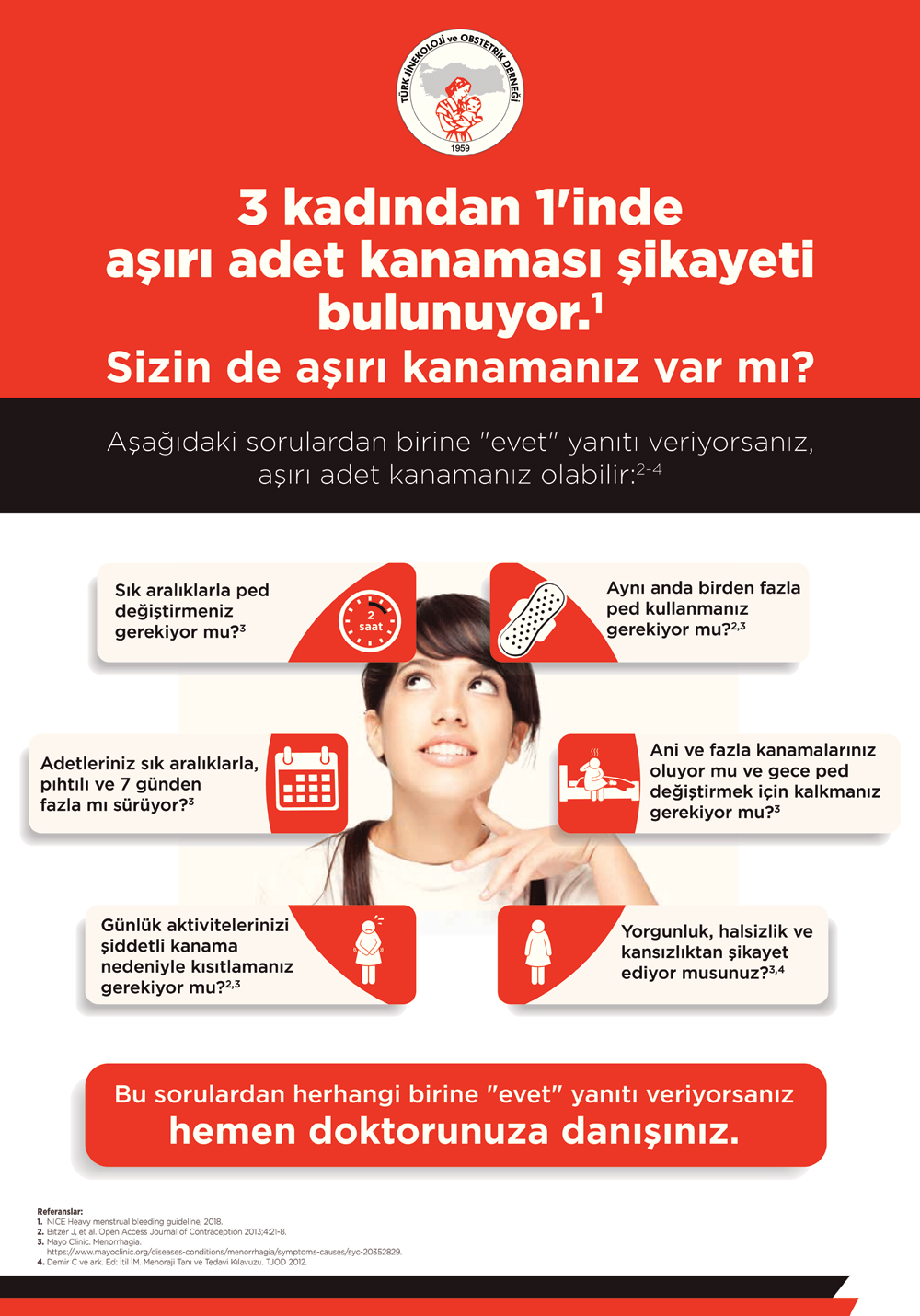 Toplulumuzda her 3 kadından 1’inde görülen anormal uterin kanama; kadınların günlük yaşamlarını olumsuz etkilemekle beraber farklı sağlık sorunlarına da sebebiyet vermektedir. Anormal uterin kanaması olan kadınların çoğunda kanama hormon dengesizliğine bağlı olabileceği gibi birçok ciddi organik nedenden de olabilir. Görülme sıklığının çok yüksek olması ve nedenleri arasında pek çok önemli sağlık sorunu yer almasına rağmen kadınlar kanama miktar ve düzensiz döngülerini kendilerince normalleştirmekte ve altında yatan sebeplerin araştırılması için biz hekimlere danışmamaktadırlar. Bu sebeple, Türk Jinekoloji ve Obstetrik Derneği olarak 8 Mart Kadınlar Gününde düzenlediğimiz “KENDİNİ ER-TE-LE-ME’’ kampanyasında olduğu gibi kadın sağlığını korumak ve geliştirmek için farkındalık yaratmak adına “Normal Olmayan Adet Kanaması için Bilinçlendirme Poster ve Broşürlerini” hazırladık. Siz meslektaşlarımızdan bu konuya özel hassasiyet rica ederek, ünitelerinizde posterlerin ve broşürlerin hastalarınızın görebileceği ilgili yerlerde konumlandırılması konusunda destek bekliyoruz.