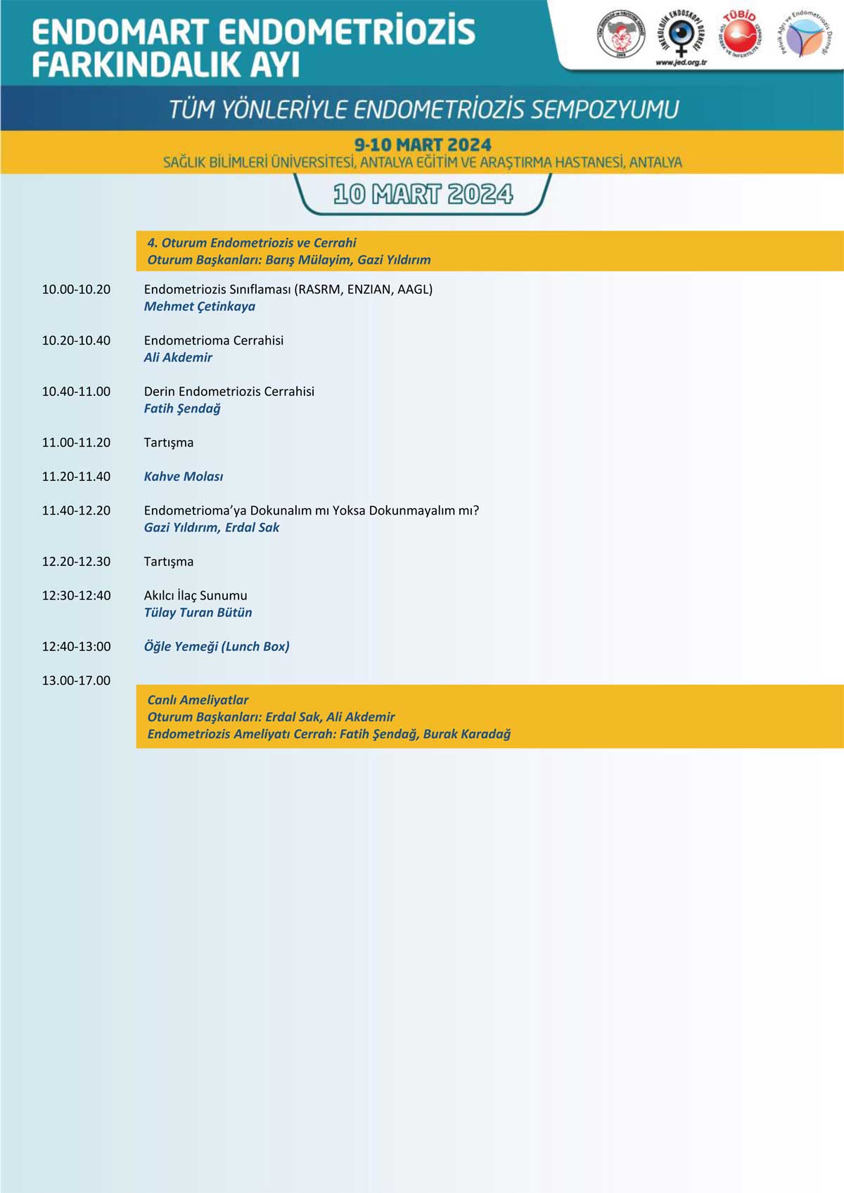 DuyurularSon Duyurular TÜM YÖNLERİYLE ENDOMETRİOZİS SEMPOZYUMU | 9-10 Mart 2024 Katılım için tıklayınız https://forms.gle/WjStpfchUsVJ12778 Katılım için tıklayınız https://forms.gle/WjStpfchUsVJ12778