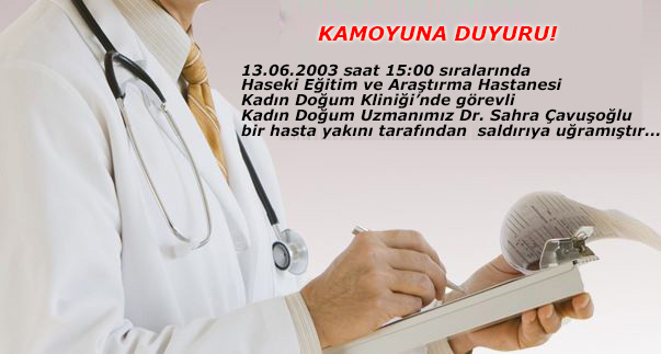 13.06.2003 saat 15:00 sıralarında Haseki Eğitim ve Araştırma Hastanesi Kadın Doğum Kliniği’nde görevli Kadın Doğum Uzmanımız Dr. Sahra Çavuşoğlu bir hasta yakını tarafından saldırıya...