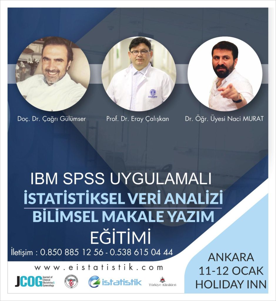 11-12 Ocak 2020’de Ankara Holiday Inn Otel’de pratik SPSS uygulamalı İstatistik Veri Analizi düzenleyeceğiz. Katılımcılara ek olarak TJOD dergisi ve JCOG dergisi himayesinde “makale yazım kursu” “endNote kullanım kursu” da verilmiş olacak. 6 ay online olarak eğitim düzenli devam edecek. 6 ay boyunca ücretsiz İstatistik analiz desteği verilecek. Tüm bu süreç sonunda kendi kendinize SPSS üzerinden istatistiksel temel ve orta düzey istatistiksel analizleri yapabileceksiniz. Pratik uygulamalı kurs olduğu için katılımcı sayısı 30 ile sınırlıdır. Bu bakımdan ilgilenenlerin ivedilikle kayıt yaptırmalarını tavsiye ederiz. Kursların detaylı programlarını ve tüm bilgilerine paylaştığım PDF dökümanından ulaşabilirsiniz.