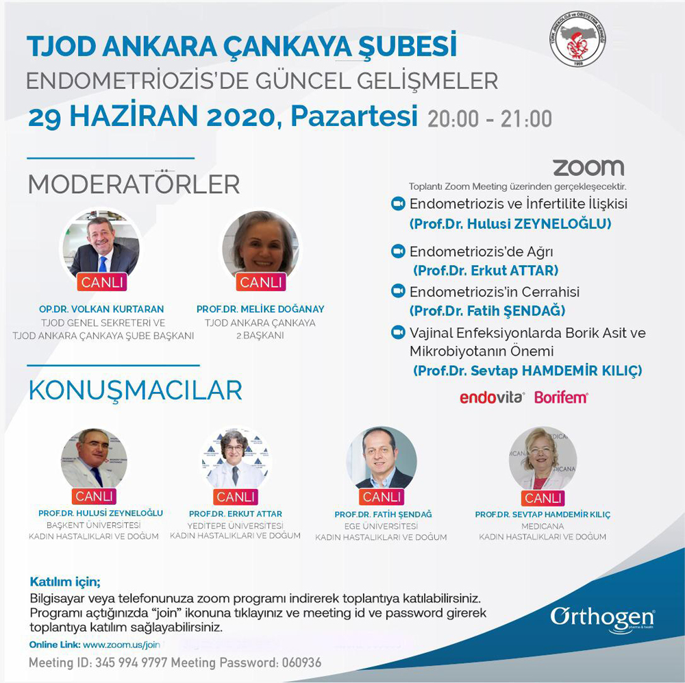 Son DuyurularEtkinliklerTjod Bölge Toplantıları TJOD Ankara Çankaya Şubesi Toplantısı | Endometriosiz’de Güncel Gelişmeler – 29 Haziran 2020 Katılım için www.zoom.us ID: 345 994 9797 PASS: 060936