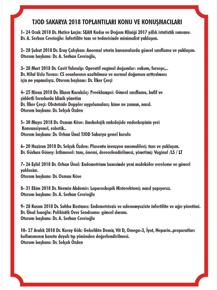 TJOD Sakarya Şubesi 2018 Yılı Toplantı Takvimi