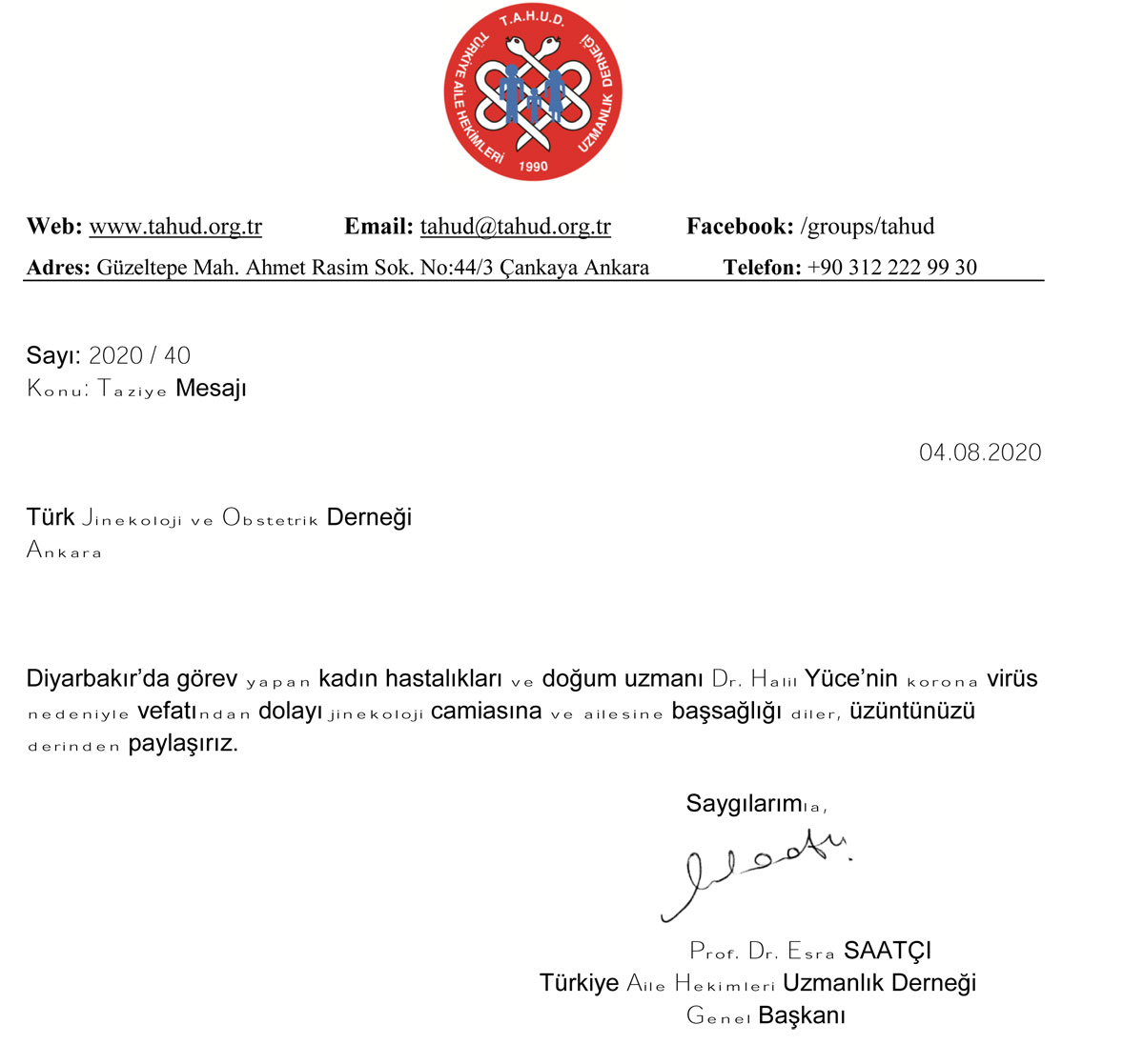 Türkiye Aile Hekimleri Uzmanlık Derneği’den Taziye Mesajı